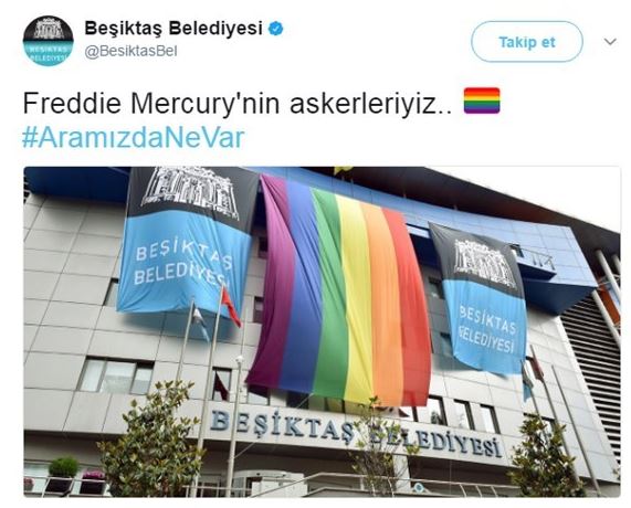 2017 yılında ise Beşiktaş Belediyesi’nin LGBTİ+ Onur Haftası dolayısıyla belediye binasına gökkuşağı bayrağı asmasının ardından belediyenin sosyal medya hesabından, “Freddie Mercury’nin askerleriyiz” tweet’i atıldı.