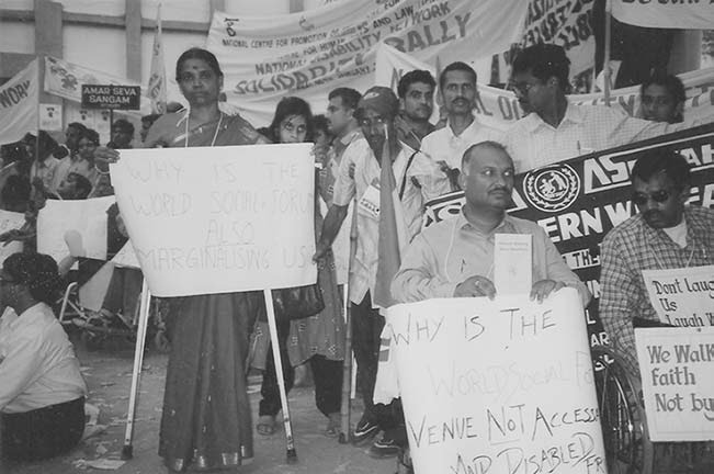 Üstteki resim: Bombay, Hindistan'da düzenlenen 2004 Dünya Sosyal Forumu'na katılan sakat aktivistler --fotoğraf, Sosyal Forum'da genel anlamda erişilebilirlik düzenlemeleri ve sakatlığın yerine ilişkin bir protestodan (fotoğrafı McRuer'in Crip Theory kitabından aldık). En önde sağda tekerlekli sandalyeli iki erkek var; birinin tuttuğu döviz,, 'Dünya Sosyal Forumu neden erişilebilir ve sakat-dostu değil?' diye soruyor. Yanındaki adamın boynuna asılı iki döviz var. Biri 'Bize gülme, bizle beraber gül' diyor; diğerinin tamamı görülmüyor. Arkalarında ayakta duran bir kişi de döviz taşıyor; ne yazdığı seçilmiyor. Önde ortada iki koltuk değneğiyle ayakta bir kadın; tuttuğu döviz 'neden Dünya Sosyal Forumu da bizi dışlıyor?' diye soruyor. Arkada resmin sağ ucundan sol ucuna sıralanan bir kalabalık var, bir tane tekerlekli sandalye seçiliyor. Kalabalığın üzerinde yükselen iki büyük pankart var. Birinde muhtemelen Ulusal, Sakatlıkla Dayanışma Ağı Yürüyüşü yazıyor. Diğeri seçilmiyor. Yine fotoğrafın uzak köşesinde de pankartlar görünüyor. McRuer, sözkonusu kitabında bu protestoların Dünya Sosyal Forumu katılımcıları için öneminden bahsediyor s. 42-48.