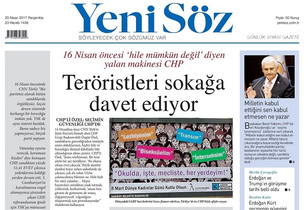 Gazete Perşembe günü basılan sayfalarına, “Teröristleri Sokağa Davet Ediyor” başlıklı bir yazı hazırlamış. Yazı, CHP’nin mühürsüz “evet” oylarını da geçerli kabul eden YSK’ya itirazlarını karalamış gibi görünse de, yazının manşet görselinin LGBTİ’leri hedef aldığını fark ediyorsunuz. Kadıköy Belediyesinin LGBTİ farkındalığı için hazırladığı afişlerden birini yazıya görsel olarak seçen Yeni Söz, resmin altına şöyle not düşmüş: “Dünyadaki LGBT hareketlerini Soros finanse ederken, Türkiye'de ise CHP böyle afişler asıyor.” Verilen mesaj “kızım sana söylüyorum, gelinim sen anla” mıdır nedir? Lafı uzatmadan Yeni Söz’ün yeni sloganı “kusacak çok nefretimiz var” olsa daha şık olmaz mı yahu?