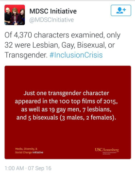 2015 yılında en iyi 100 filmden sadece 1'inde trans karakter görülürken 19 gey, 7 lezbiyen, 5 biseksüel (3'ü erkek, 2'si kadın) var.