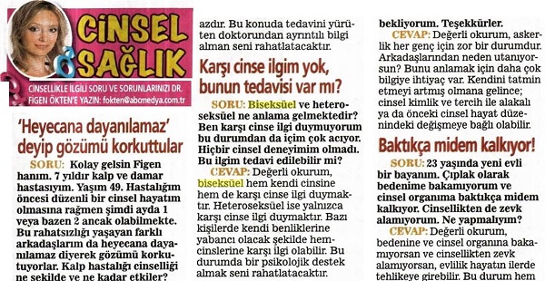Cumartesi günü sayfalarında, karşı cinse ilgi duymadığı için endişelenen, bu durumunun bir hastalık olup olmadığını ve biseksüel ve heteroseksüelin ne anlama geldiğini soran okuruna Figen Ökten biseksüel ve heteroseksüel tanımlarını açıklayarak şöyle cevap vermiş: “Bazı kişilerde kendi benliklerine yabancı olacak şekilde hemcinslerine karşı ilgi olabilir. Bu durumda bir psikolojik destek almak seni rahatlatacaktır.” Figen Ökten’in önceki cevaplarından eşcinselliği hastalık olarak ifade etmediğini okumuştuk. Bu yanıtı ise oldukça yoruma açık… Eşcinsel olmak kendi benliğine yabancılaşmak anlamına gelmiyor ayrıca okuyucuna yardımcı olmak için cinsel ilginin yönelebileceği tek cinsiyetin karşı cinsiyet olmadığını da eklemesi gerekirdi. Üstü kapalı bir biçimde Ökten, okurunun aklına eşcinselliği getirmemeye çalışmış gibi görünüyor…