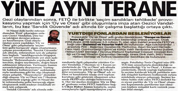 Gastelere hâkim bir diğer tavır yaklaşan referandumda iktidarı destekleyen ya da iktidara yakın kişi ve grupları “hayır”cılara karşı kışkırtmak… Yeni Akit’ten Bahri Davarcı’nın “Yine Aynı Terane” başlıklı yazısı referandum üzerinden insanları birbirine kırdırmak için yazılmış. Bahri Davarcı, Oy ve Ötesi’nin “yurttaşlık hakkını kullanma bahanesiyle” seçime şaibe karıştıracağını ve “milli iradeye” müdahale edeceğini ileri sürüyor.