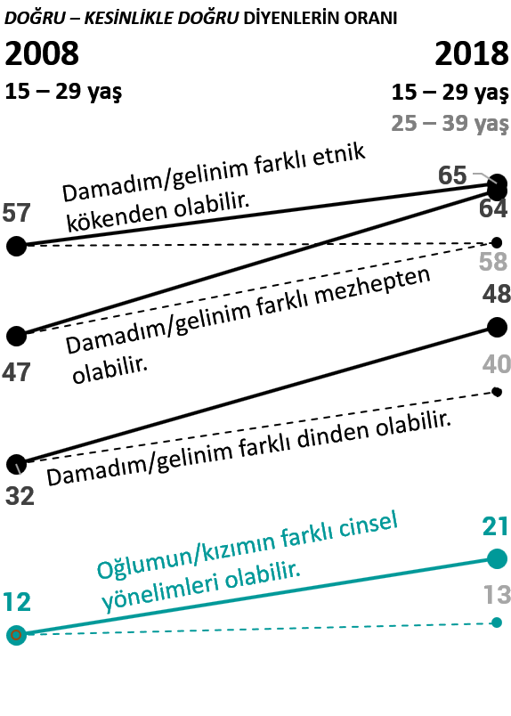 “10 Yılda Ne Değişti?” araştırmasının “Farklılıklara Saygı” kısmında, 2008'den 2018'e kadar “oğlumun/kızımın farklı cinsel yönelimleri olabilir” diyenlerin oranının %12'den %21'e yükseldiği görülüyor.